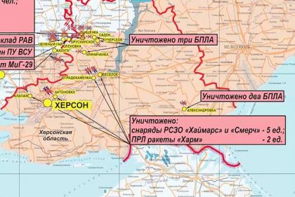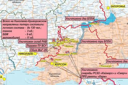 Кадр: Минобороны РФЗа минувшие сутки российские войска отразили все атаки Украины на николаево-криворожском направлении, в результате им удалось уничтожить до 130 бойцов Вооруженных сил Украины (ВСУ). В свою очередь, на краснолиманском направлении Киев потерял более 120 военнослужащих. Авиация России также сбила самолет ВСУ МиГ-29 в Николаевской области. Помимо этого, Украина предприняла неудачную попытку атаковать позиции российских войск в направлении Куземовки (ЛНР), вследствие чего потеряла более 30 бойцов.Российским войскам с момента начала проведения спецоперации удалось уничтожить 326 самолетов, 162 вертолета, 2339 БПЛА, 383 зенитных ракетных комплекса, 6046 танков и других боевых бронированных машин. Помимо этого, ликвидированы 6758 единиц специальной военной автомобильной техники.