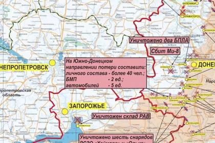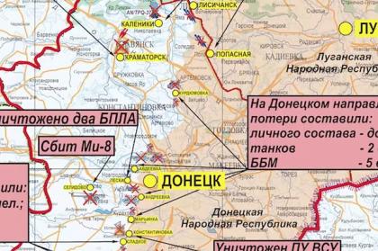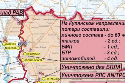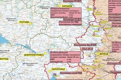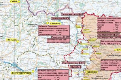 Минобороны России в ходе брифинга показало карту боевых действий на Украине по состоянию на субботу 3 декабря. Видео опубликовано в официальном Telegram-канале ведомства.На карте отражены основные события, произошедшие в зоне проведения специальной военной операции (СВО) за минувшие сутки: передвижение сторон, места боестолкновений и зоны обстрелов.Изображение: Telegram-канал «Минобороны России»По сообщению Минобороны, российским войскам удалось отразить атаки Вооруженных сил Украины на всех направлениях, где ведутся боевые действия: на донецком, южно-донецком, красно-лиманском и купянском. Суммарно на этих направлениях Вооруженные силы (ВС) России уничтожили около двухсот солдат противника.Отдельно официальный представитель Минобороны генерал-лейтенант Конашенков уточнил, что в районе Краматорска в Донецкой народной республике были поражены два пункта дислокации иностранных наемников.Материалы по теме:«Что, пацаны поедут, а ты нет?» Как мобилизованные россияне пытаются отстоять право на альтернативную службу«Что, пацаны поедут, а ты нет?»Как мобилизованные россияне пытаются отстоять право на альтернативную службу24 ноября 2022«Бежать никуда не собираемся» Что происходило в окрестностях Херсона накануне отвода российских войск«Бежать никуда не собираемся»Что происходило в окрестностях Херсона накануне отвода российских войск10 ноября 2022«В районе населенного пункта Каленики (…) уничтожена радиолокационная станция контрбатарейной борьбы производства США AN/TPQ-37. В районах населенных пунктов Табаевка Харьковской области и Приморское Запорожской области уничтожены два склада ракетно-артиллерийского вооружения и боеприпасов ВСУ», — сообщил об успехах ВС России Конашенков.По состоянию на 3 декабря российские войска уничтожили 336 самолетов, 178 вертолетов, 2609 беспилотных летательных аппаратов, 391 зенитный ракетный комплекс, 6970 танков и других боевых бронированных машин, 908 боевых машин реактивных систем залпового огня, 3652 орудия полевой артиллерии и минометов ВСУ.Ранее российская разведка оценила потери российских войск в ходе спецоперации.