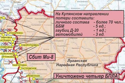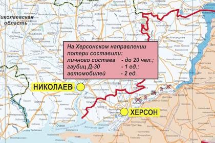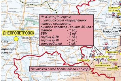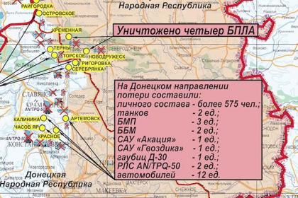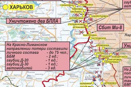 Минобороны России во время ежедневного брифинга показало карту боевых действий на Украине на субботу, 29 апреля. Видео опубликовано в официальном Telegram-канале военного ведомства.На карте отражены основные события, произошедшие в зоне проведения специальной военной операции (СВО) за последние сутки: передвижение сторон, места боестолкновений и зоны обстрелов.Изображение: Telegram-канал «Минобороны России»В первую очередь Минобороны сообщило о нанесении удара высокоточным оружием морского базирования по дислокации командного состава объединенной группировки украинских войск «Херсон». Согласно отчету, цель удара была достигнута.По сообщению официального представителя оборонного ведомства генерал-лейтенанта Игоря Конашенкова, основные потери Вооруженные силы Украины (ВСУ) понесли на донецком направлении, где с августа 2022 года продолжаются бои за город Артемовск (украинское название — Бахмут). За минувшие сутки в этом районе ВСУ потеряли убитыми не менее 575 военнослужащих и наемников.Материалы по теме:«Предлагала ввести меня в транс» Как мошенники и гадалки наживаются на родственниках пропавших в ходе СВО солдат?«Предлагала ввести меня в транс»Как мошенники и гадалки наживаются на родственниках пропавших в ходе СВО солдат?9 марта 2023«Я видела много тяжелых ранений» Военная медсестра — о службе в зоне СВО, работе под огнем и охоте на российских медиков«Я видела много тяжелых ранений»Военная медсестра — о службе в зоне СВО, работе под огнем и охоте на российских медиков8 марта 2023«Люди стоят и смотрят в небо» Как живет Белгород — город на границе спецоперации«Люди стоят и смотрят в небо»Как живет Белгород — город на границе спецоперации19 октября 2022Конашенков добавил, что сейчас бои проходят в западной части города. В них участвуют штурмовые отряды под прикрытием российских десантников.На всех прочих направлениях ВСУ потеряли около 250 бойцов. Среди уничтоженной за сутки украинской техники — 14 украинских беспилотных летательных аппаратов, вертолет Ми-8, две радиолокационные станции контрбатарейной борьбы AN/TPQ-50 и три танка.Всего с начала спецоперации российские войска уничтожили 413 самолетов, 230 вертолетов, 3901 беспилотный летательный аппарат, 421 зенитный ракетный комплекс, 8904 танка и 9843 единицы специальной военной автомобильной техники ВСУ.